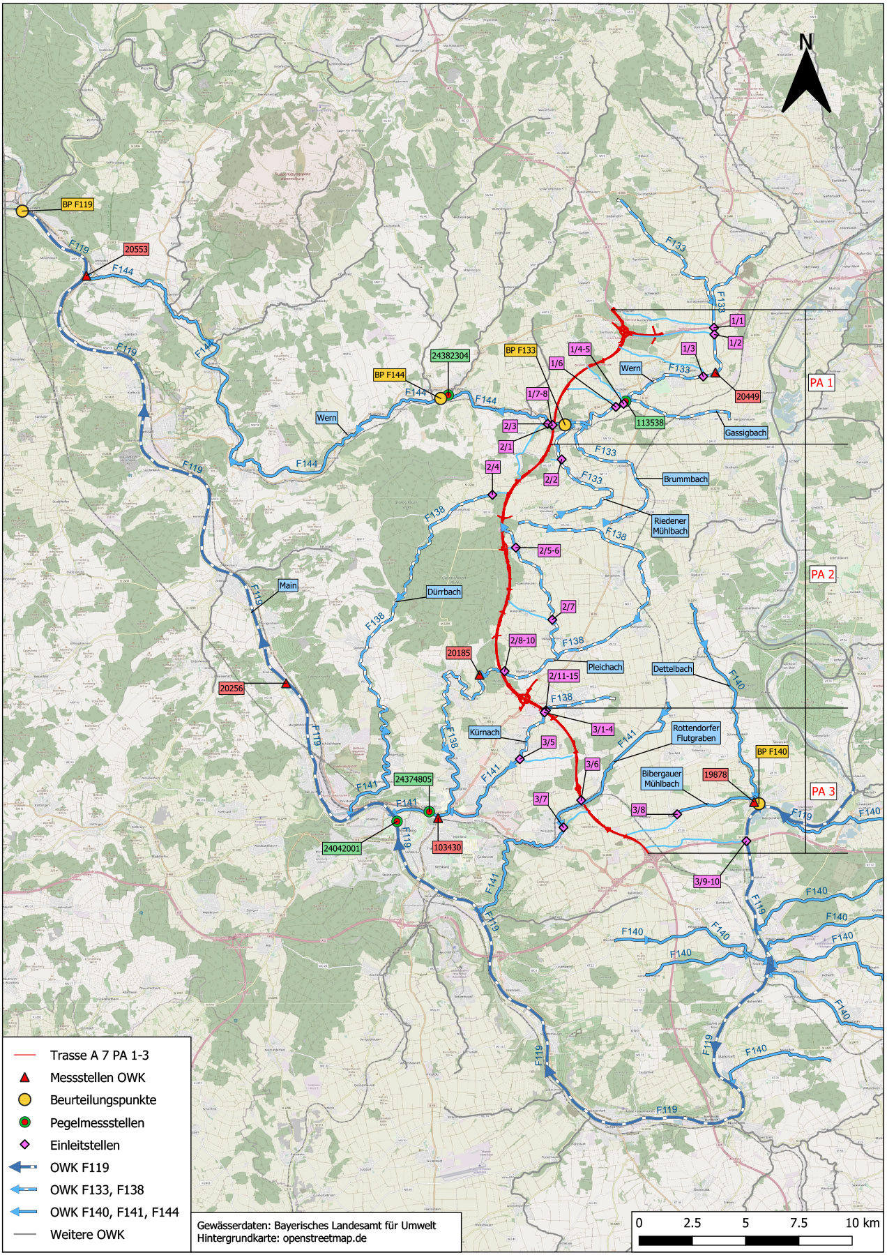 Diese Leistungen wurden den 6‑streifigen Ausbau der BAB A 7 — Planungsabschnitt 1 bis 3 (AK Schweinfurt/ Werneck bis AK Biebelried) erbracht (insges. ca. 31 km, 6 Oberflächenwasserkörper, 2 Grundwasserkörper). Die Ausweisung der Oberflächenwasserkörper als Zusammenfassung von mehreren kleinen voneinander unabhängigen Nebengewässern stellte große Anforderungen an die Beurteilung der Auswirkung der Einleitungen bezogen auf den gesamten Oberflächenwasserkörper.